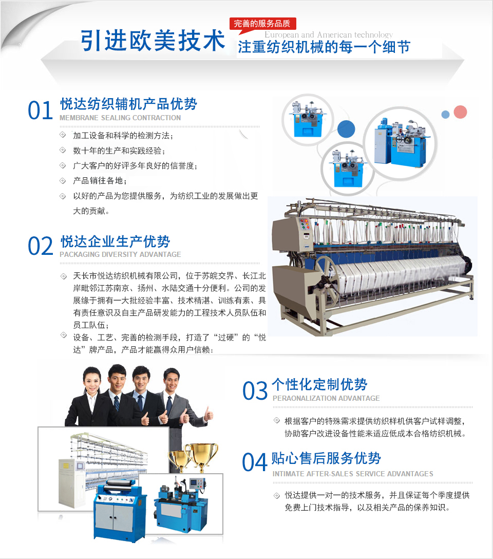 天長市悅達紡織機械有限公司座落在皖東天長市仁和集鎮(zhèn)人民西路88號,公司位于蘇皖交界、長江北岸毗鄰江蘇南京、揚州、水陸交通十分便利。 公司是主要生產(chǎn)紡織平車安裝工具、紡部輔件及配件綜合性企業(yè)。已有二十多年的生產(chǎn)歷史,在激烈的市場競爭中始終保持優(yōu)良的質(zhì)量、優(yōu)化的價格、齊全的品種優(yōu)勢。產(chǎn)品暢銷全國各地,深受新老客戶的好評。 公司以服務(wù)客戶滿足用戶為己任,不斷提高產(chǎn)品加工精度,拓展系列品種,以高標(biāo)準(zhǔn)、高起點滿足客戶需求。公司精神:創(chuàng)新、開拓、務(wù)實。公司宗旨:追求誠信、追求質(zhì)量、追求服務(wù)、為用戶著想。